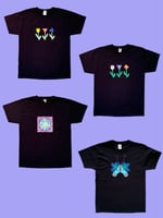 Handmade appliqué on brand new t-shirts. Made from hand cut fabric scraps that were machine stitched on to a size M Hanes black t-shirt. Designs based on my tattoo flash.