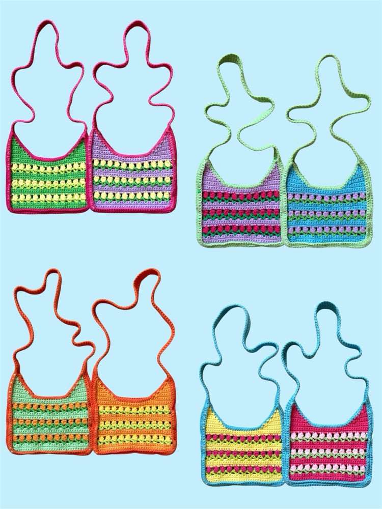 Handmade crochet floral striped purse. Double sided color ways. Long strap for crossbody or shoulder use. Reversible for less boxy appearance. 100% cotton.