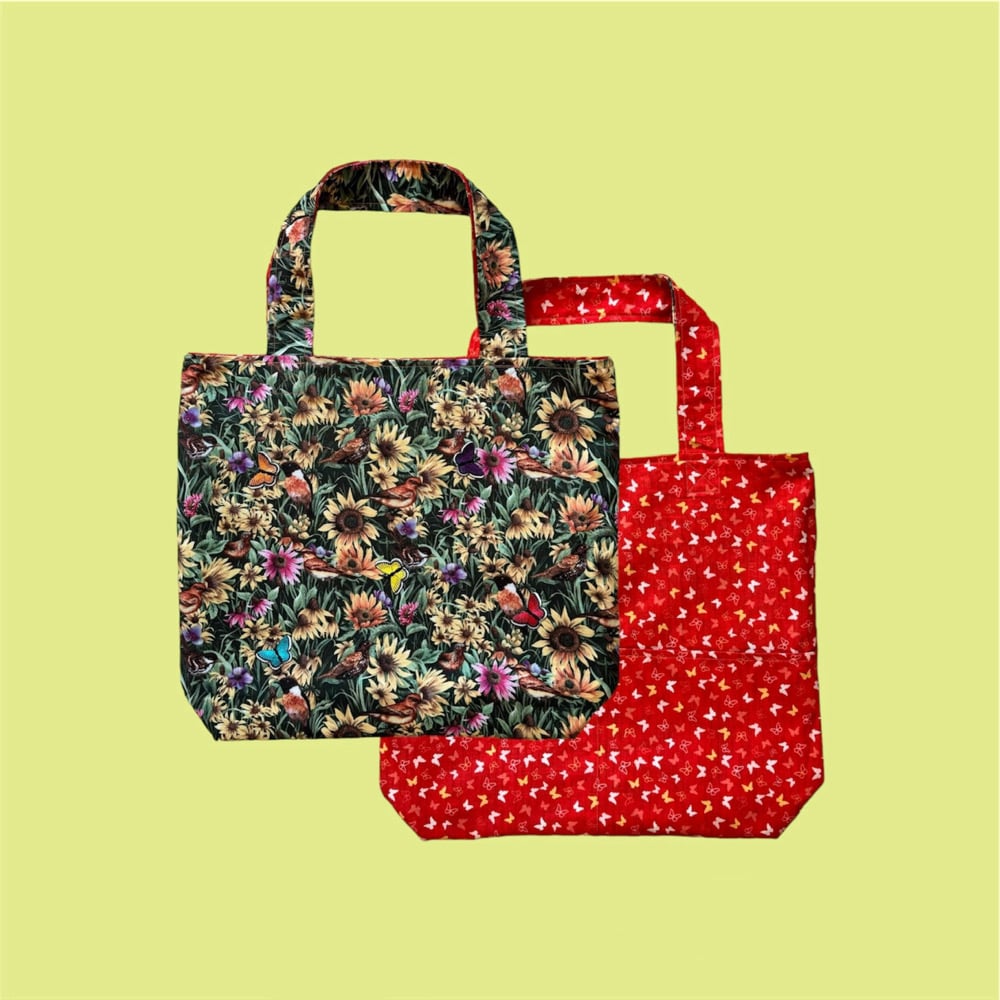 1 - One side is red with little butterflies all over with 2 pockets, and the other side is a green garden print with flowers & birds and butterfly patches that I’ve added. Sewn with orange thread. 100% cotton.