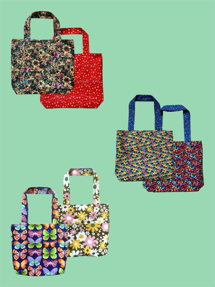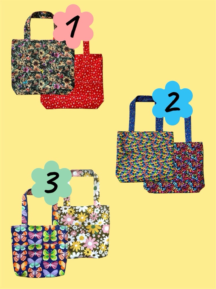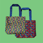 2 - One side has mini rainbows with 2 pockets, and the other side is a rainbow vine print, and the handles are a blue with rainbow dots. Sewn with blue thread. 100% cotton.
